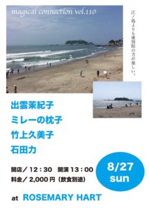 8月27日(日)に今池「カフェあらたると」で開催予定だったマジカルコネクションvol.110ですが、会場店舗オーナー様の急病により、東別院「ローズマリーハート」で開催する運びとなりました。つきましては開店が12時30分、開演が13時と早まりましたのでお気をつけください。急な変更で大変申し訳ありません。事情が事情ですのでご理解くださいますよう、何卒よろしくお願いいたします。(主催者より)
